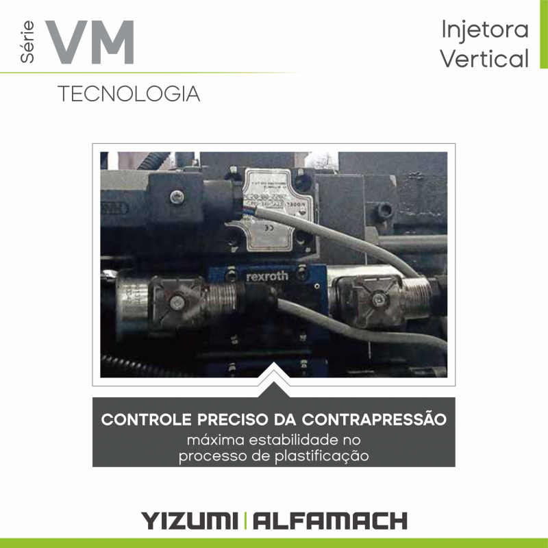 • Unidade de injeção com sensores de pressão e controle proporcional de contrapressão, oferecendo alta precisão e repetibilidade de peso com variação inferior a ±0,3%.