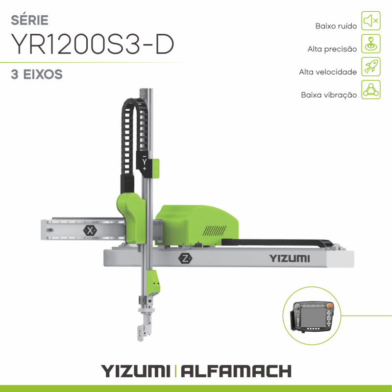 O Robô YIZUMI YR1200S3-D de 3 eixos é uma solução de automação projetada para máquinas injetoras de 320 a 400 toneladas, oferecendo um excelente equilíbrio entre alto alcance, precisão e velocidade. Assim como outros modelos da série, ele se destaca pelo baixo ruído e baixa vibração, essenciais para um ambiente de produção otimizado. A utilização de componentes de ponta, como o Servo PANASONIC, garante a confiabilidade e a repetibilidade dos movimentos.