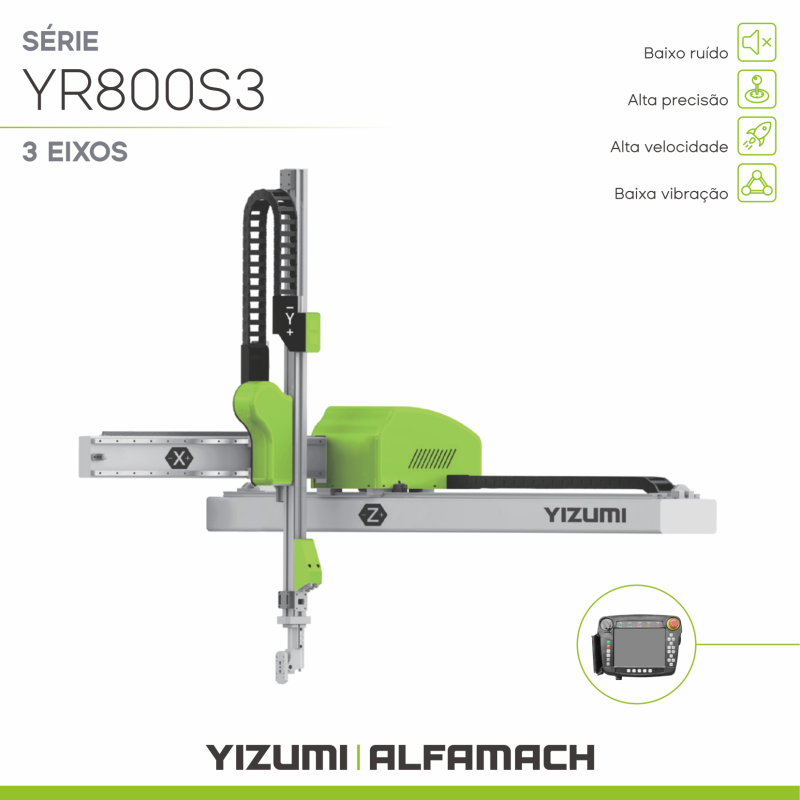 O Robô YIZUMI YR800S3 de 3 eixos é projetado para oferecer alta performance e precisão em processos de automação industrial. Com foco em baixo ruído, alta precisão, alta velocidade e baixa vibração, este modelo é ideal para otimizar o ciclo de produção em máquinas de moldagem por injeção de 60 a 90 toneladas. Sua construção robusta e o uso de guia linear nos eixos garantem movimentos consistentes e duradouros.